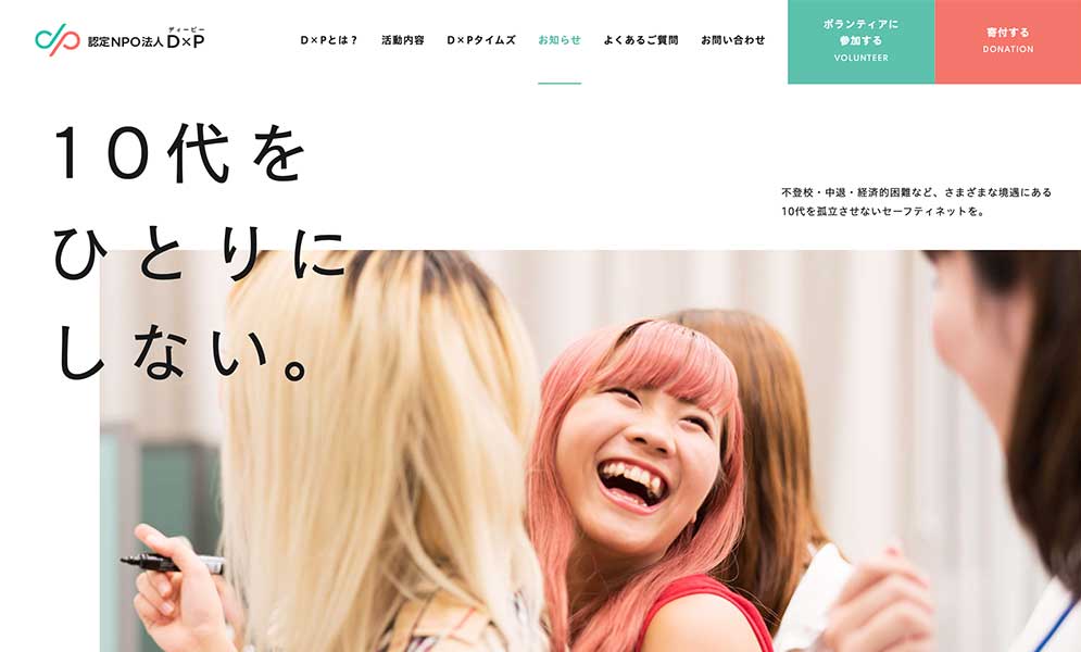 経済的困難、中退、虐待などの困難な環境下にあるユース世代の孤立を解決する認定NPO法人です。D×Pは、LINEで全国から相談を受けたり食糧支援・現金給付を実施する「ユキサキチャット」や、大阪ミナミでは、ゆっくりと休憩ができる「ユースセンター」の運営といった活動を行っています。